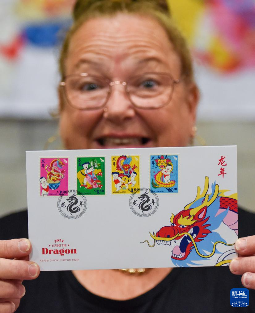 2月3日,一名新西兰邮政工作人员在奥克兰展示2024年中国农历龙年生肖邮票首日封。