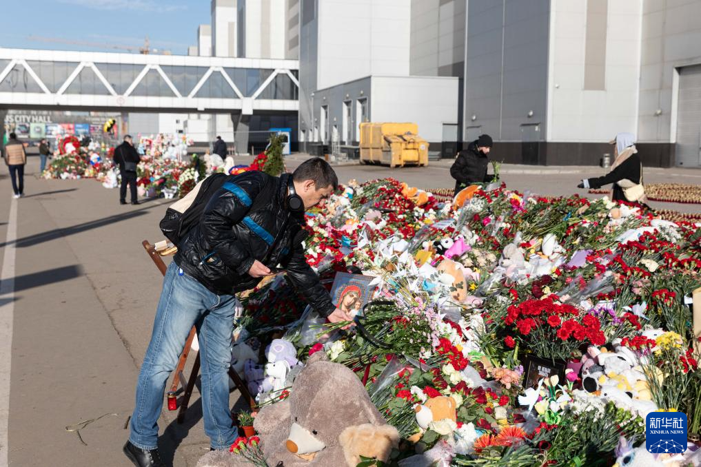 3月28日,人们在俄罗斯首都莫斯科近郊“克罗库斯城”音乐厅前摆放鲜花和玩具,悼念遇难者。