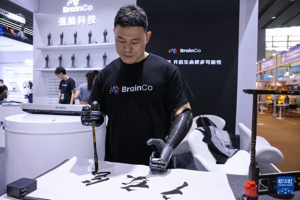 强脑科技员工倪敏成在第135届广交会上展示智能仿生手(2024年4月15日摄)。失去双前肢的倪敏成佩戴智能仿生手后,生活能够自理,还能写书法。