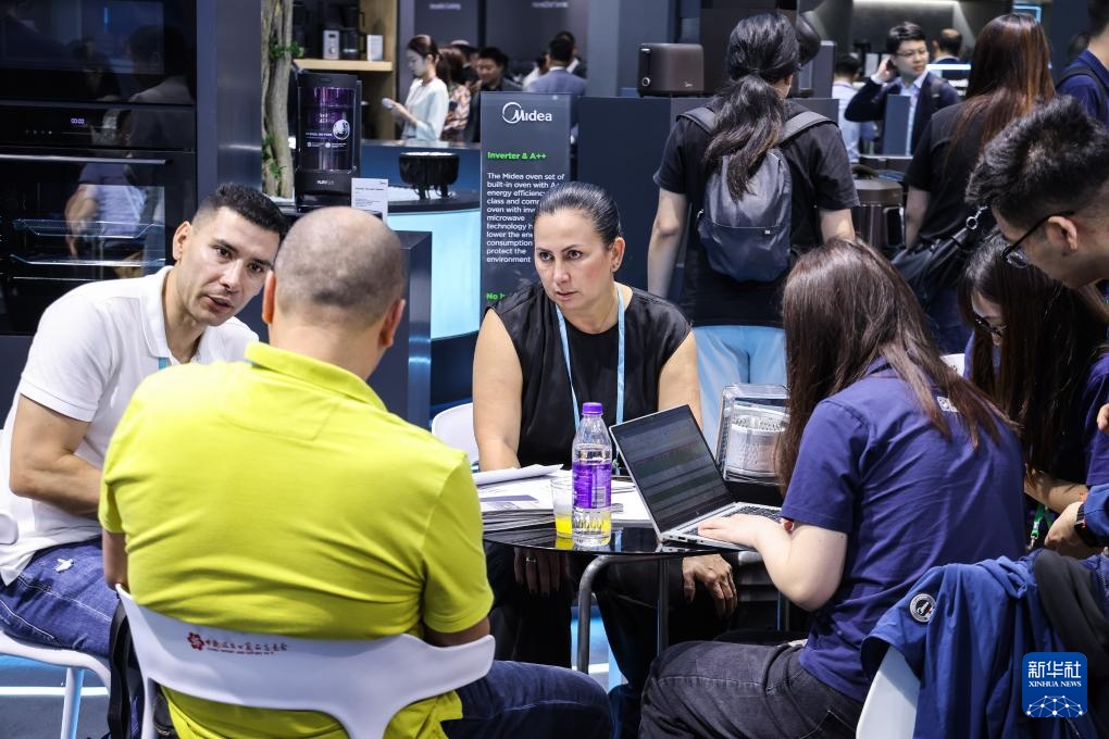 境外采购商在第135届广交会美的集团的展位洽谈(2024年4月15日摄)。本届广交会参展企业中,国家级高新技术企业、制造业单项冠军、专精特新“小巨人”等超5500家,比上届增长20%。