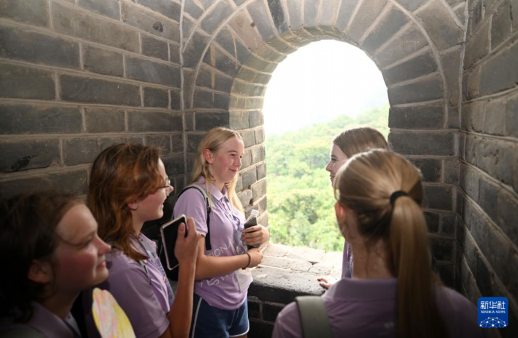 7月24日,来自瑞典的少年儿童在游览黄崖关长城。