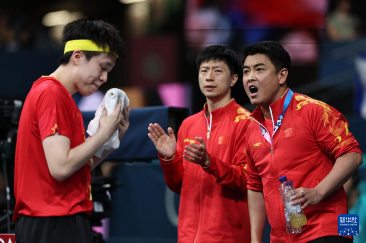 8月8日,中国队教练王皓(右)指导王楚钦。王楚钦3比1战胜法国队选手艾利克斯·勒布伦。新华社记者 王东震 摄