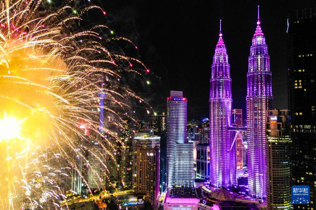 2025年1月1日凌晨,新年烟花在吉隆坡的马来西亚国家石油公司双塔旁绽放(无人机拍摄)。