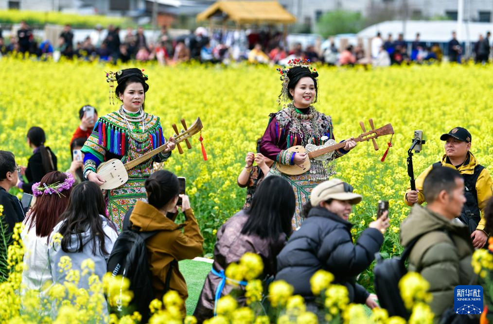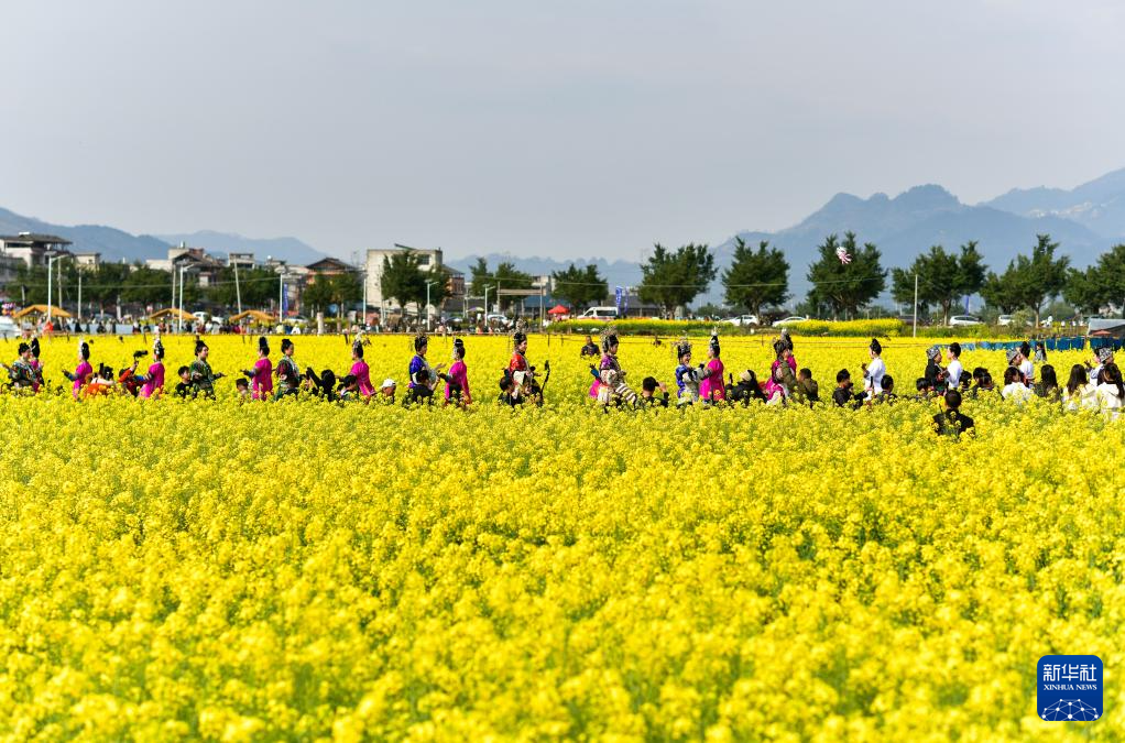 3月16日,在贵州省榕江县车江大坝,村民们穿着民族盛装参加花田走秀。