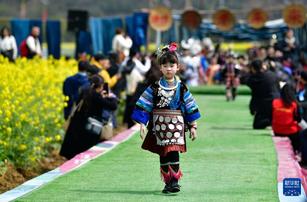 3月16日,在贵州省榕江县车江大坝,小朋友穿着民族盛装参加花田走秀。