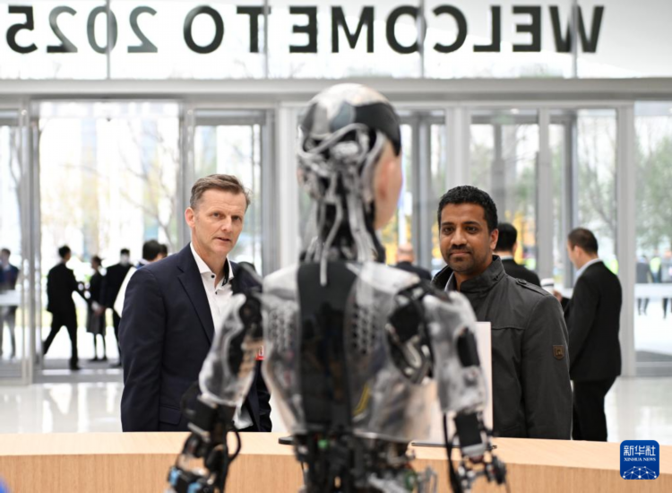3月27日,人们在中关村国际创新中心咨询台参观仿生人形机器人。