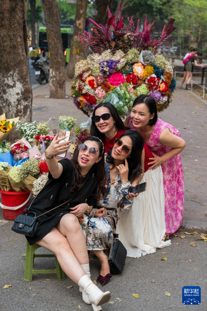 3月25日,人们在越南河内街头与“自行花车”合影。