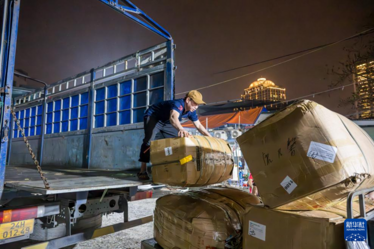 3月28日,在越南河内广霸花市,商贩将产自中国云南的鲜花从货车上搬运下来。