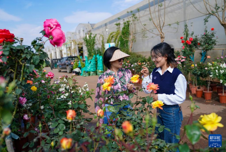 4月11日,越南花商阮翠云(左)与翻译李青歌在中国云南昆明斗南一花卉基地内查看鲜花品质。
