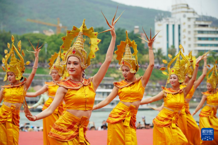 4月13日,在西双版纳傣族自治州景洪市,演员在傣历新年节(2025年泼水节)庆祝大会上表演。