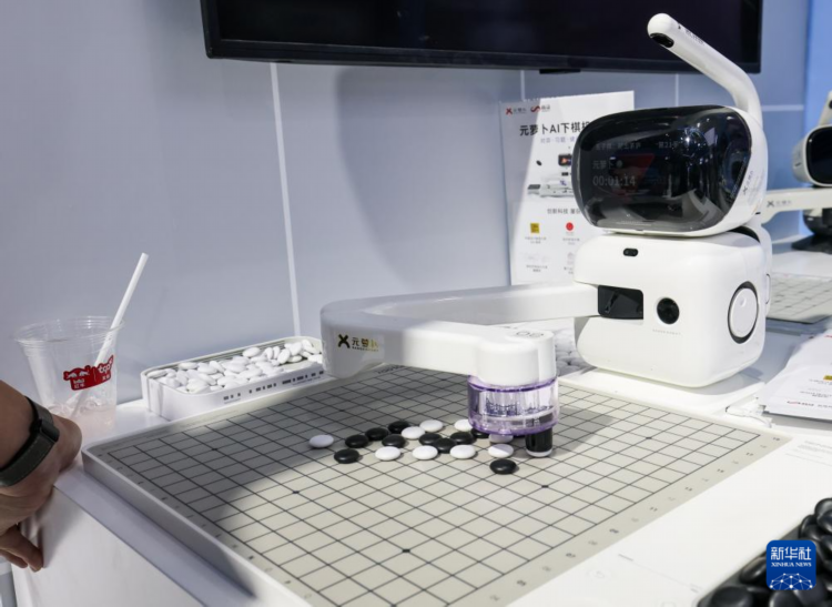 4月14日在第五届消博会上拍摄的AI下棋机器人。