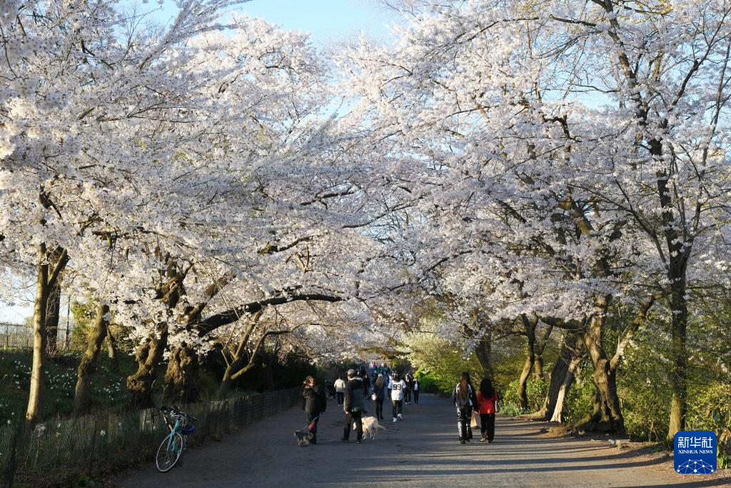 4月13日,人们在美国纽约中央公园的樱花下休闲。