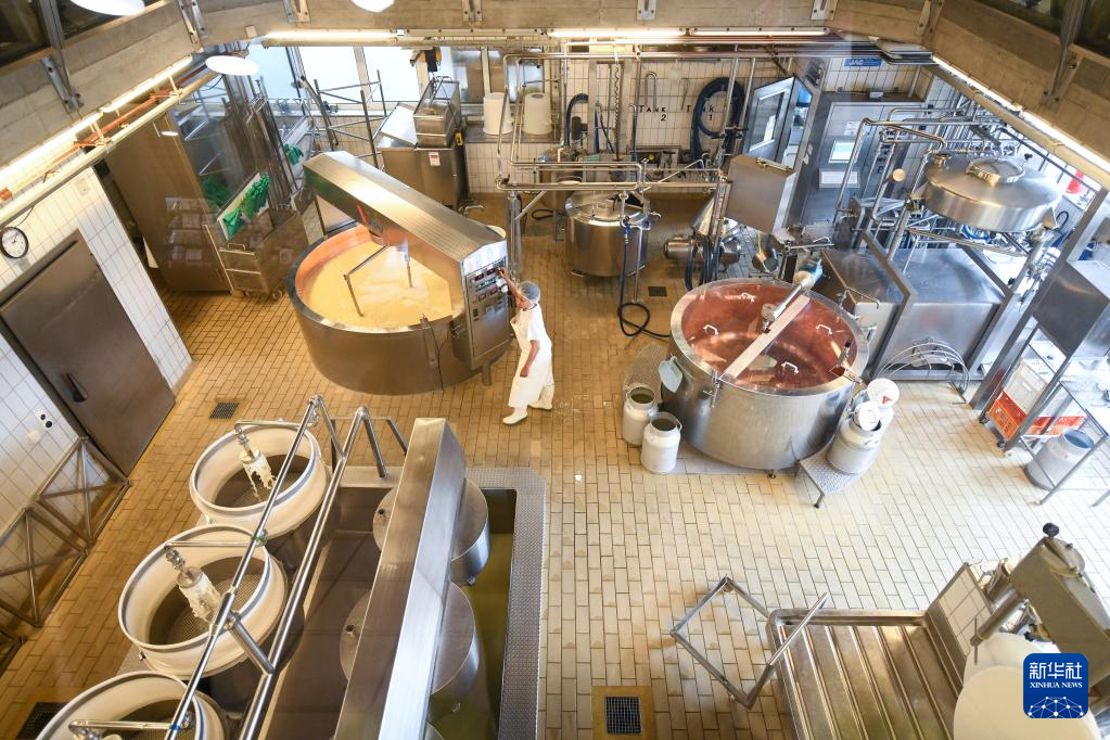 4月12日,在瑞士埃默河谷阿福尔特恩,工作人员在奶酪厂工作。