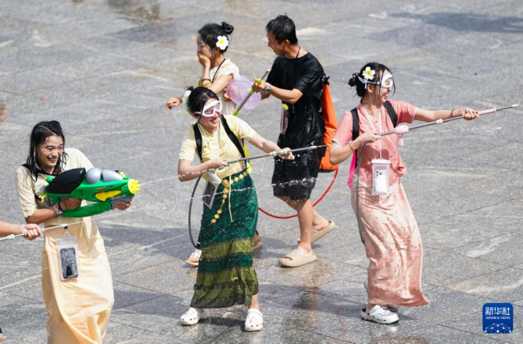 当日,云南多地举行泼水节活动,各族群众和游客用相互泼水的方式互送祝福,庆祝泼水节。
