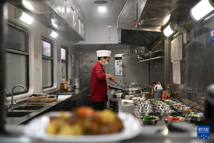 4月16日,“美丽中国乡村游”康养旅游专列厨师在餐车烹饪。