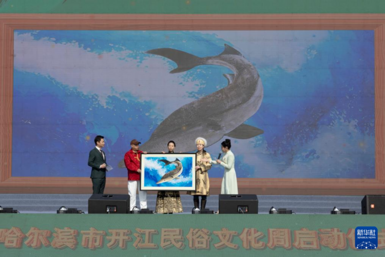 4月16日,非遗传承人在2025哈尔滨市开江民俗文化周启动仪式现场展示用鱼皮、桦树皮和秸秆制作的作品。