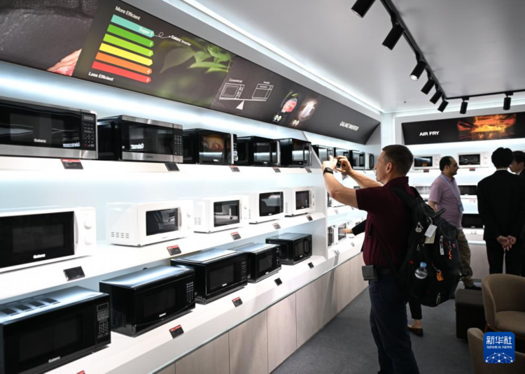 4月15日,在第137届广交会的智慧生活专区,境外采购商参观格兰仕家电产品。