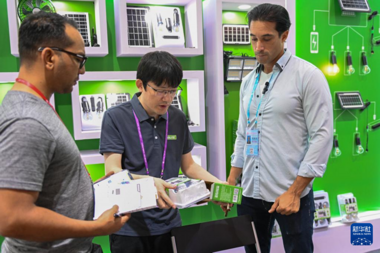 4月16日,参展商在第137届广交会的新能源展区向客商展示产品。