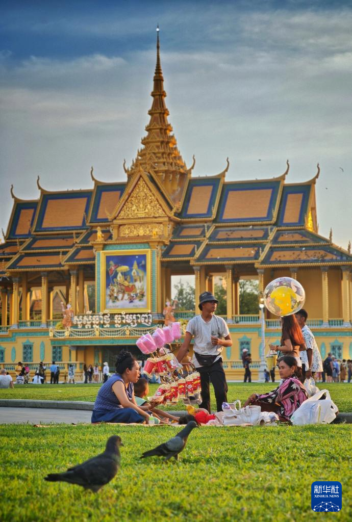 4月14日,人们在柬埔寨金边王宫外的广场休闲。