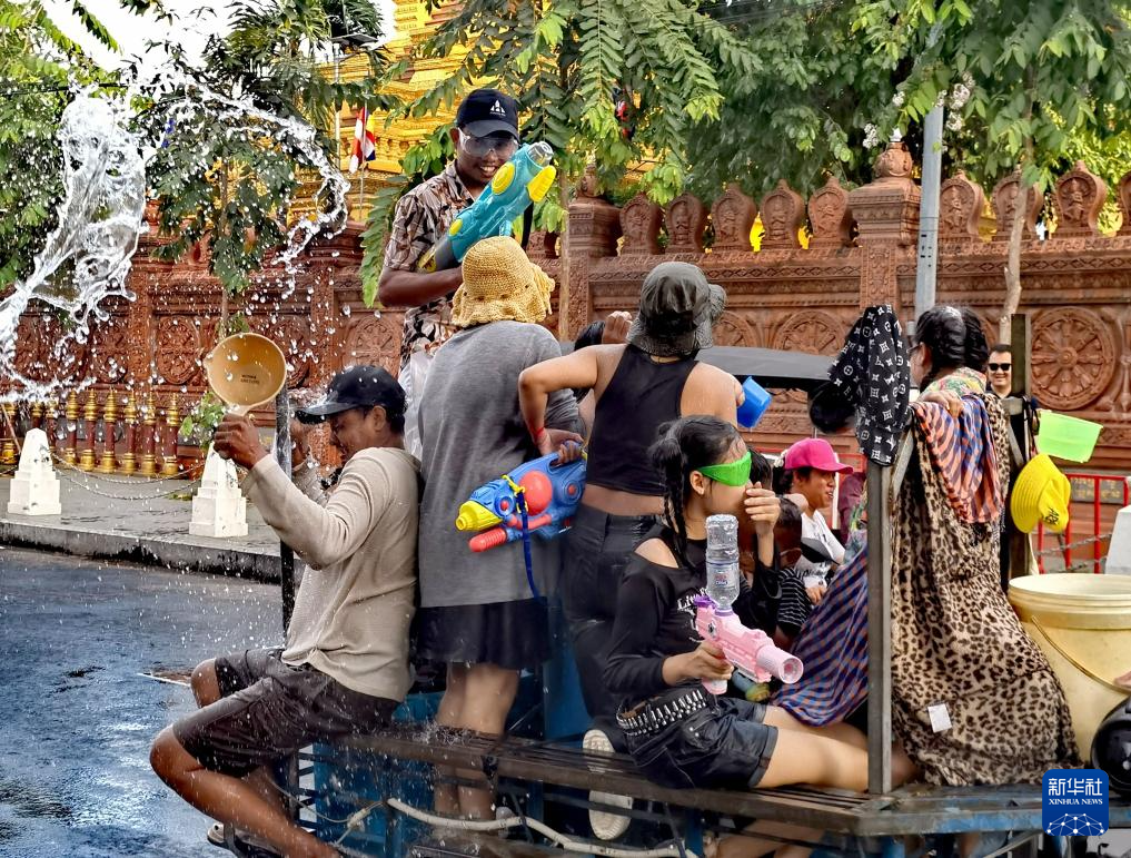 4月14日,在柬埔寨金边,人们参加泼水节活动庆祝新年。