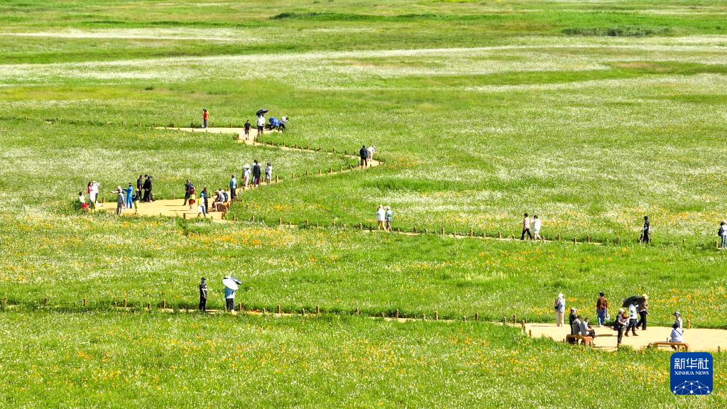 盛夏时节,内蒙古锡林郭勒盟正蓝旗金莲川草原迎来最佳观赏期,金黄色的花海与苍茫草原相映成趣,世界文化遗产元上都遗址的断壁残垣在草原上清晰可见。游人流连花丛中或驻足遗址前,感受自然野趣与历史文化。