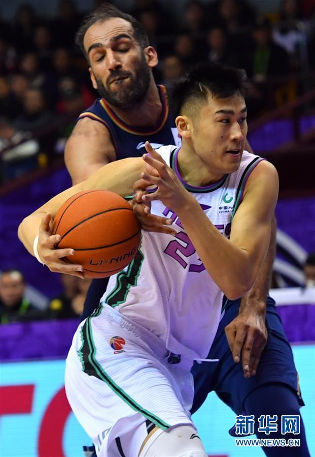 12月3日,山东西王队球员贾诚(前)突破南京同曦宙光队球员哈达迪的防守。 当日,在2019-2020赛季中国男子篮球职业联赛(CBA)常规赛第13轮比赛中,山东西王队主场以132比122战胜南京同曦宙光队。 新华社记者朱峥摄