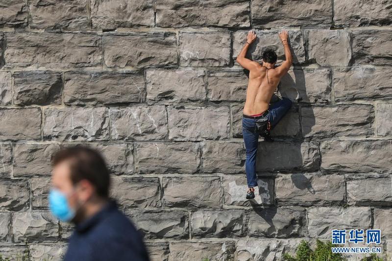 6月9日,在比利时布鲁塞尔的五十周年纪念公园,一名男子练习攀岩。