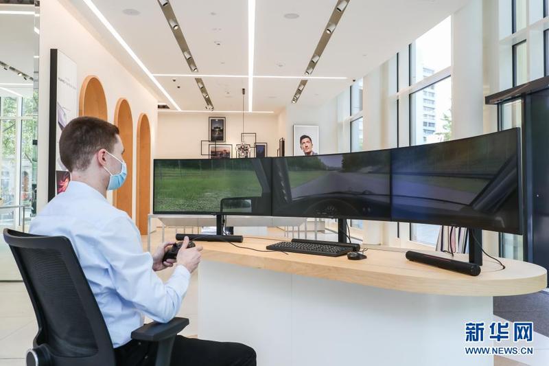6月8日,在德国首都柏林的华为旗舰店,一名工作人员展示拼接显示屏。