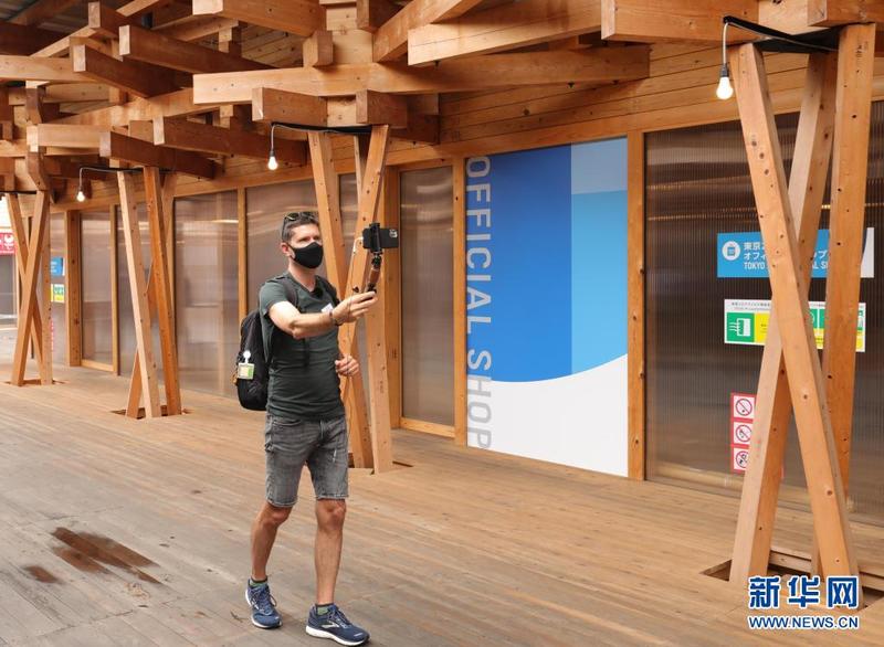 6月20日,一名记者在东京奥运会奥运村的官方商店外拍摄。