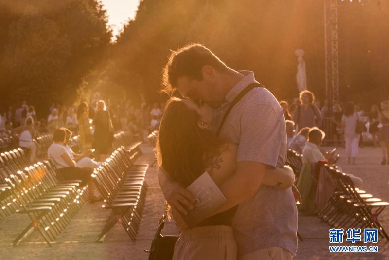 6月18日,在奥地利维也纳的夏夜音乐会现场,一对情侣在演出开始前拥吻。