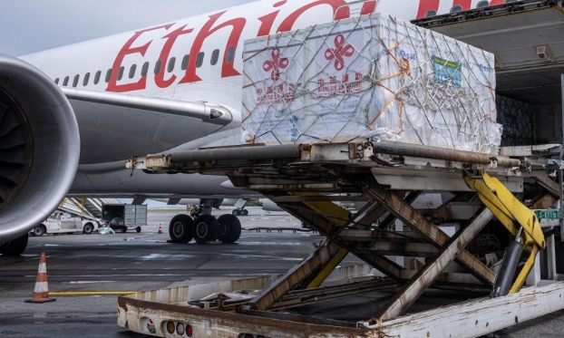 6月23日,在科特迪瓦阿比让国际机场,中国援助的新冠疫苗从飞机上卸下。
