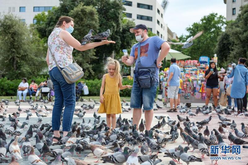 6月26日,游客在西班牙巴塞罗那加泰罗尼亚广场喂鸽子。