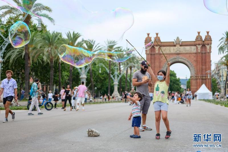 6月26日,游客在西班牙巴塞罗那凯旋门附近游玩。