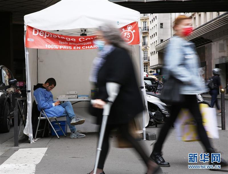 这是6月30日在法国巴黎老佛爷百货商场外拍摄的快速新冠病毒检测点。 为期四周的法国2021年度夏季打折季于30日拉开帷幕,将持续至7月27日。 新华社记者高静摄