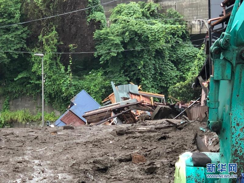 这是7月4日在日本静冈县热海市拍摄的在泥石流灾害中受损的建筑残骸。