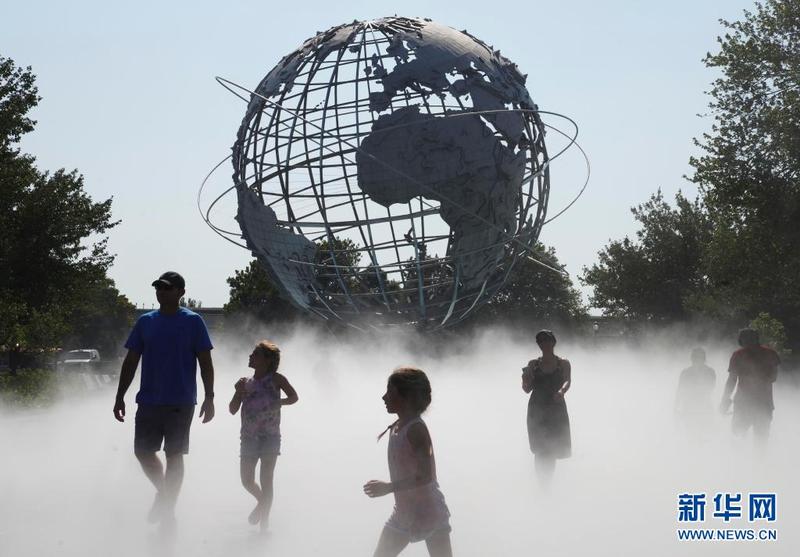 8月13日,人们在美国纽约科罗纳公园的水雾广场休闲。