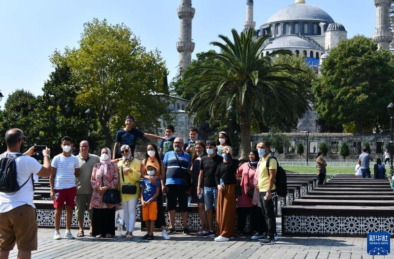 8月24日,游客在土耳其伊斯坦布尔的蓝色清真寺附近合影留念。