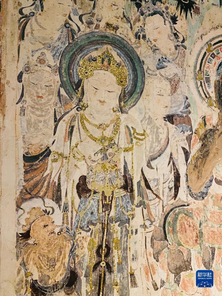 这是9月13日在日本东京艺术大学美术馆拍摄的用“文化遗产克隆技术”做出的敦煌莫高窟第57窟壁画《弥勒说法图》局部。