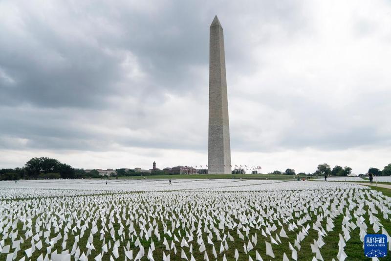 9月16日,在美国首都华盛顿,白色旗帜摆放在草坪上悼念新冠逝者。