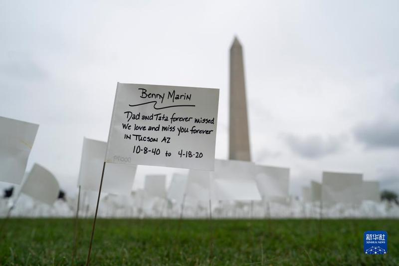 9月17日,写有缅怀亲人词句的白色旗帜摆放在美国首都华盛顿的华盛顿纪念碑附近的草坪上,悼念美国超过66万名新冠逝者。