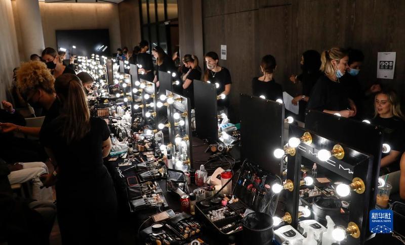 9月21日,模特、造型师等在英国伦敦时装周后台为理查德·奎因品牌走秀做准备。