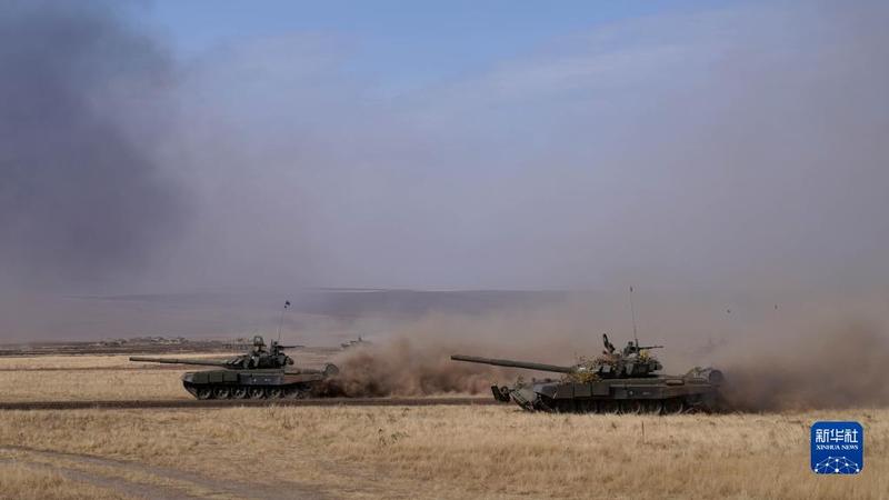 9月23日,在俄罗斯奥伦堡州东古兹靶场举行的“和平使命-2021”上海合作组织联合反恐军事演习实兵实弹演习中,多国联合部队地面突击群坦克部队迅猛出击。新华社记者 梅世雄 摄