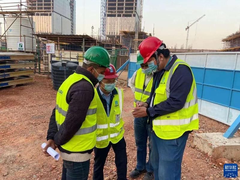 这张手机拍摄的资料照片显示,埃及新首都中央商务区项目安全总监兼项目安全部经理刘景昆(右一)在项目建设工地检查安全生产情况。