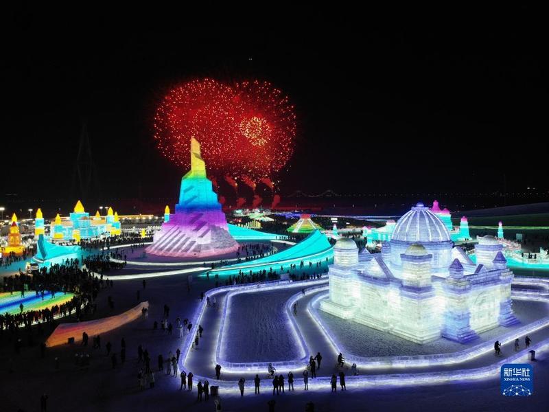 这是2021年12月31日拍摄的哈尔滨冰雪大世界上空的“烟花秀”(无人机照片)。 当晚,为迎接新年的到来,在第二十三届哈尔滨冰雪大世界的夜空中,上演了一场璀璨的“烟花秀”。新华社记者 张涛 摄 |