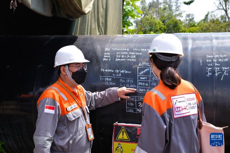 2021年12月13日,在印度尼西亚东加里曼丹省拉韦拉韦项目施工现场,项目经理崔国军(左)介绍施工情况。新华社记者 徐钦 摄 “项目部就像我的第二个家,我担任翻译和文员,还得到了很多额外的培训机会,帮助我学习成长,”安妮塔说,“项目部一直传递给我和其他本地员工的理念就是,只要足够努力,目标就能达成。” |