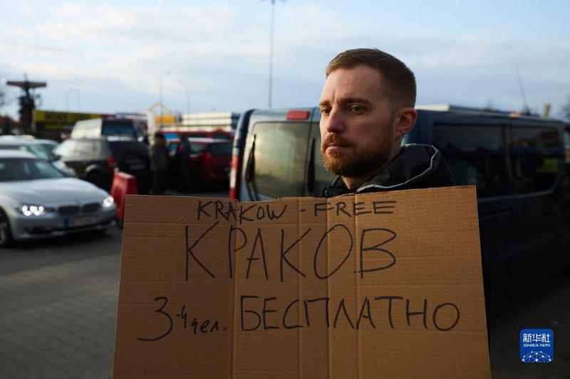 2月26日,在波兰普热梅西尔,一名男子举着牌子,写上将要去往的目的地,表示可免费载人前往。 俄罗斯和乌克兰爆发的武装冲突,打破了波兰边境城市普热梅西尔往日的平静。这里距离乌克兰仅10公里左右。 新华社记者 孟鼎博 摄 |