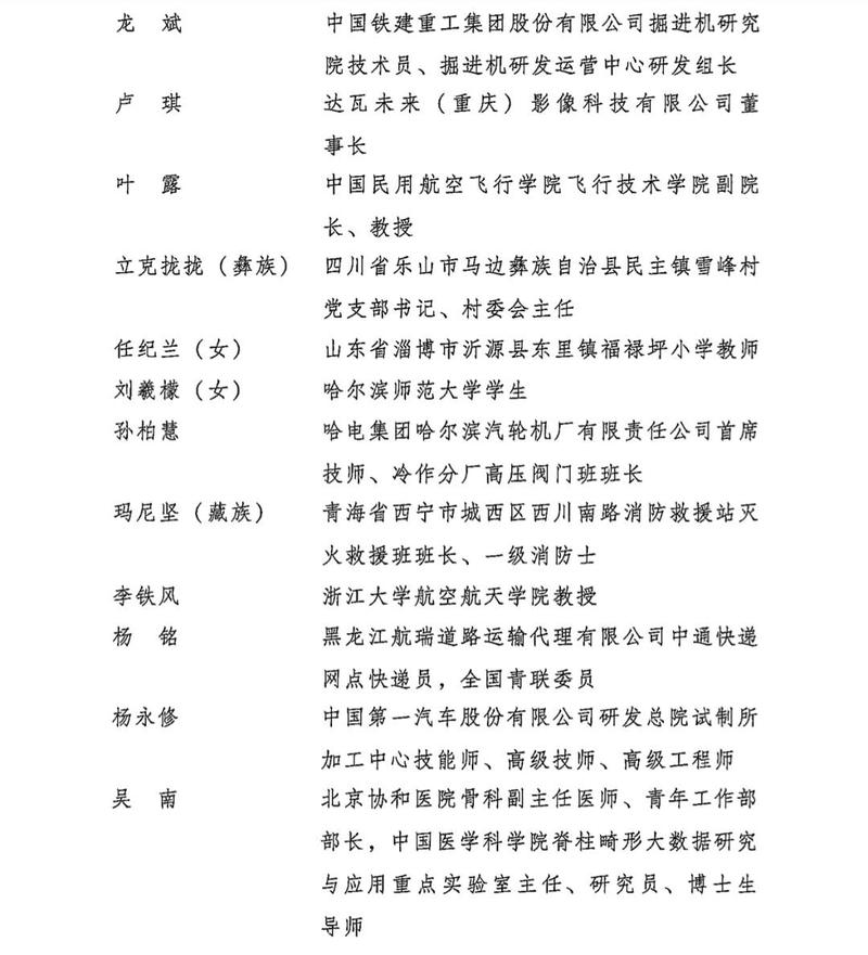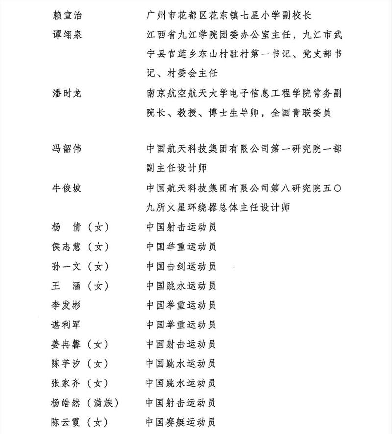 为充分发挥青年典型模范带头作用,激励广大青少年踔厉奋发、勇毅前进,以优异成绩喜迎党的二十大胜利召开,共青团中央、全国青联共同颁授第26届中国青年五四奖章,决定授予马瑜婷等49名同志第26届中国青年五四奖章,授予首钢集团冬奥服务保障青年团队等16个青年集体第26届中国青年五四奖章集体。确认冯韶伟等73名同志获第26届中国青年五四奖章、中国航天科技集团有限公司第六研究院八〇一所载人航天推进系统部等17个青年集体获第26届中国青年五四奖章集体。 受到表彰的青年和集体,是新时代青年的杰出代表,是全国广大青年学习的榜样。 在他们中,有十二年如一日深耕水稻遗传育种与应用研究的周雷,有为建设航天强国勇攀高峰的黄震,有打破国外微波光子学技术垄断的潘时龙,有将铁路勘察技术提升至国际领先水平的中铁第一勘察设计院集团有限公司川藏铁路地质科研队……他们在科学与技术研发的最尖端破局开路,让科研报国的信念赓续相传。 在他们中,有长期驻扎在东海救助前线的女搜救机长宋寅,有在平凡岗位上作出不凡义举的“托举哥”张裕,有勇闯险境、壮我国威的公安英模邹路遥,有在国际比武中打破射击纪录的精武标兵侯国领,有在边境一线缉枪缉毒、打击犯罪的云南省临沧市镇康县军赛边境检查站……他们冲锋在保护人民生命财产安全的第一线,忠诚践行了“人民至上、生命至上”的理念。 在他们中,有奋战生产一线、心灵手巧的“大国工匠”杨永修,有扎根乡村基层、化解矛盾纠纷的法律工作者王其欣,有坚持19年“背着母亲去上学”的孝老爱亲模范刘羲檬,有用11年时间培养36名世界跳绳冠军的乡村体育教师赖宣治,有扎根南疆、芬芳桃李的西部计划志愿者接力支教服务队……他们以青春之我传递着力量与温暖,彰显了当代青年的责任与担当。 在他们中,有可爱可敬的新时代中华体育健儿们。使命在肩、不畏强手,顽强拼搏、争取荣光……他们充分展示出中国精神、中国力量,让鲜艳的五星红旗在国际赛场上频频升起,高高飘扬! 未来属于青年,希望寄予青年。接过中华民族伟大复兴的接力棒,当代青年要向榜样学习,在青春无悔的人生航路上做开拓者,在报国强国的接续奋斗中做实干家,不负韶华、不负时代、不负人民,在青春的赛道上奋力跑出最好成绩! 以下为第26届中国青年五四奖章获奖者名单: