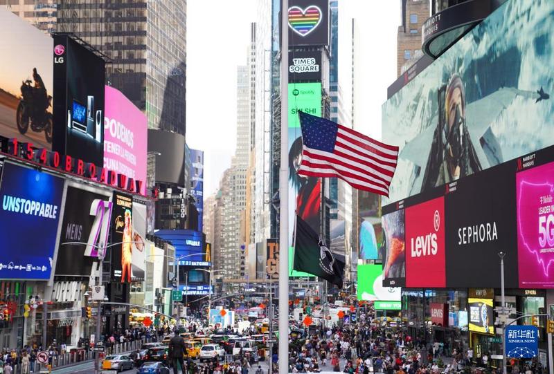 这是5月17日在美国纽约时报广场拍摄的美国国旗。