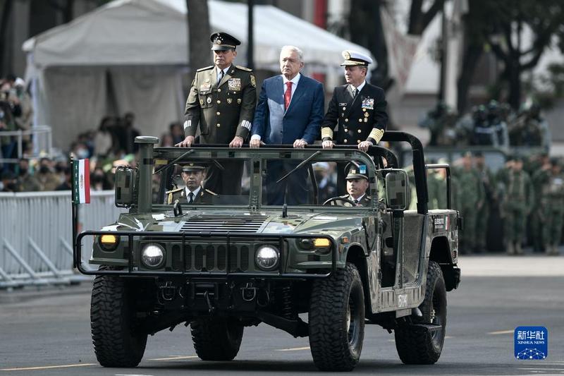 9月16日,在墨西哥首都墨西哥城,墨西哥总统洛佩斯(中)出席独立日阅兵式。