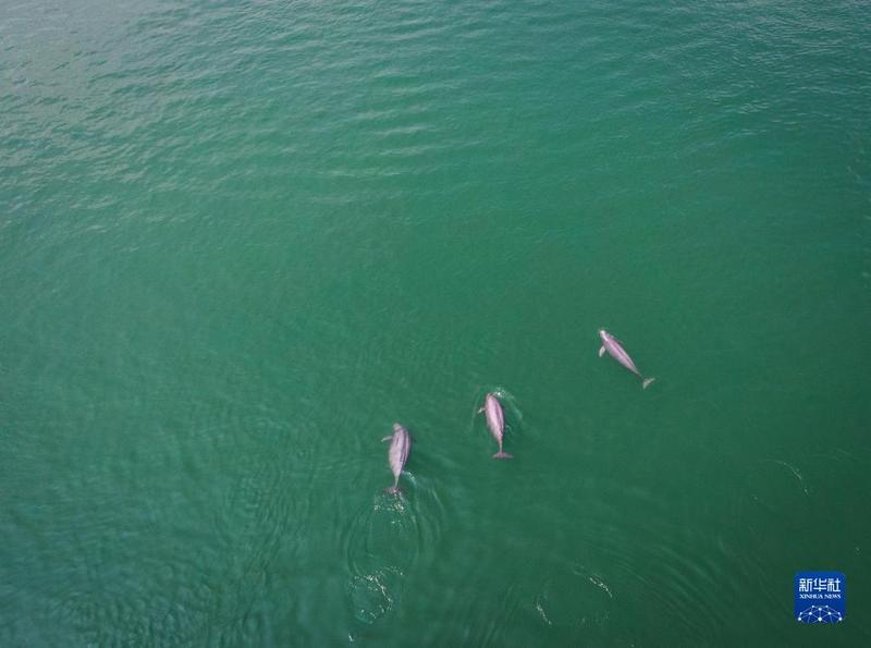 在湖北省宜昌市,长江江豚在水中嬉戏(2021年5月11日摄,无人机照片)。新华社记者 肖艺九 摄 顺着戴年华手指的方向,记者看到,粼粼碧波中,好几头长江江豚正迎浪嬉戏。它们时而跃水翻腾,时而喷水换气,几头幼豚绕着母亲在水中游动,如影随形,其乐融融。 戴年华说:“这群江豚中有3头幼豚,它们出水很高,皮肤也光滑,说明身体很健康。”